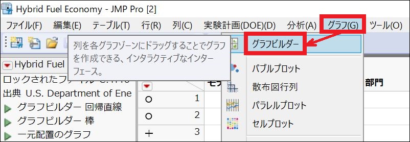 1. まず、JMPを起動して対象データを開きます。「ヘルプ」>「サンプルデータフォルダ」と進み、「Hybrid Fuel Economy」を選択します。