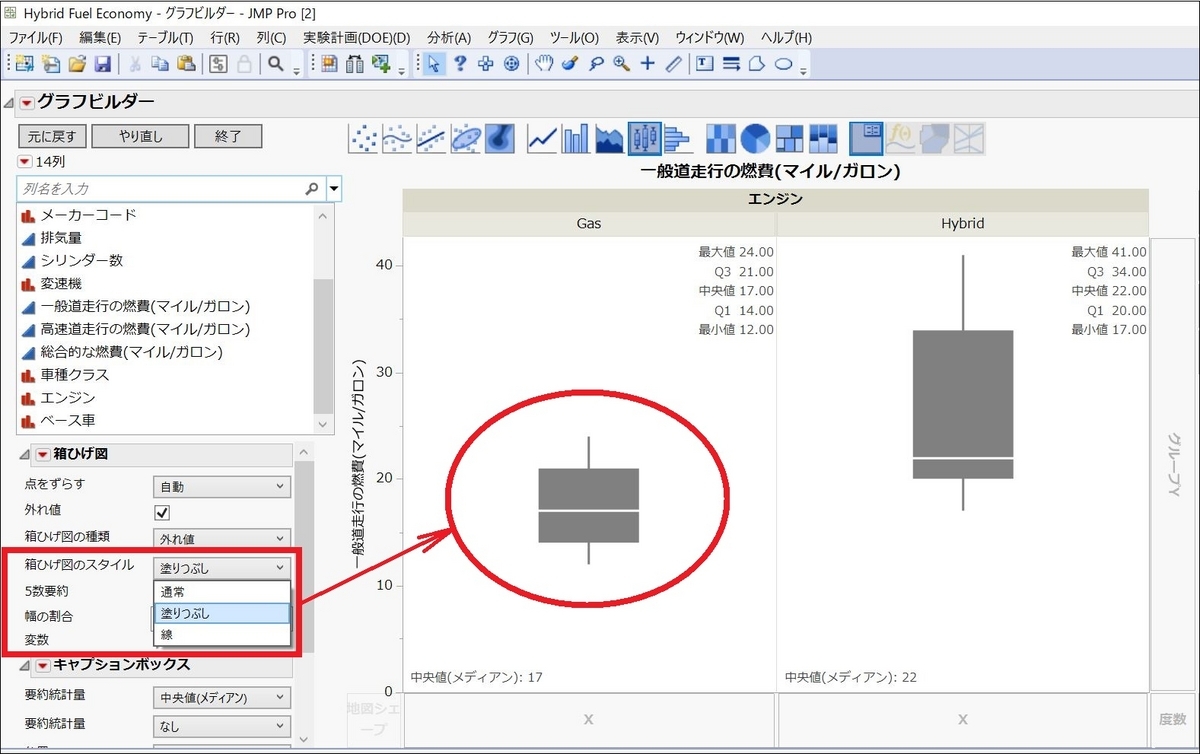 JMPの「箱ひげ図」は、箱の色を変えることもできます。左の「箱ひげ図」内、「箱ひげ図のスタイル」から「塗りつぶし」を選ぶと、箱の色がグレーになりました。