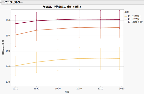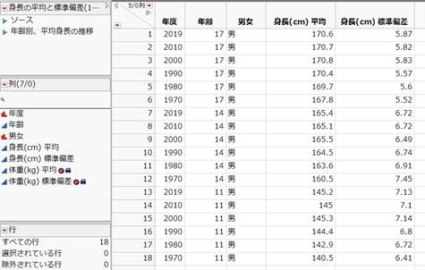 1970年度からおよそ10年おきに、男子学生11歳(小学生)、14歳(中学生)、17歳(高校生)の調査対象者に平均身長、標準偏差データとして取得し、JMPのデータテーブルにまとめてみました。